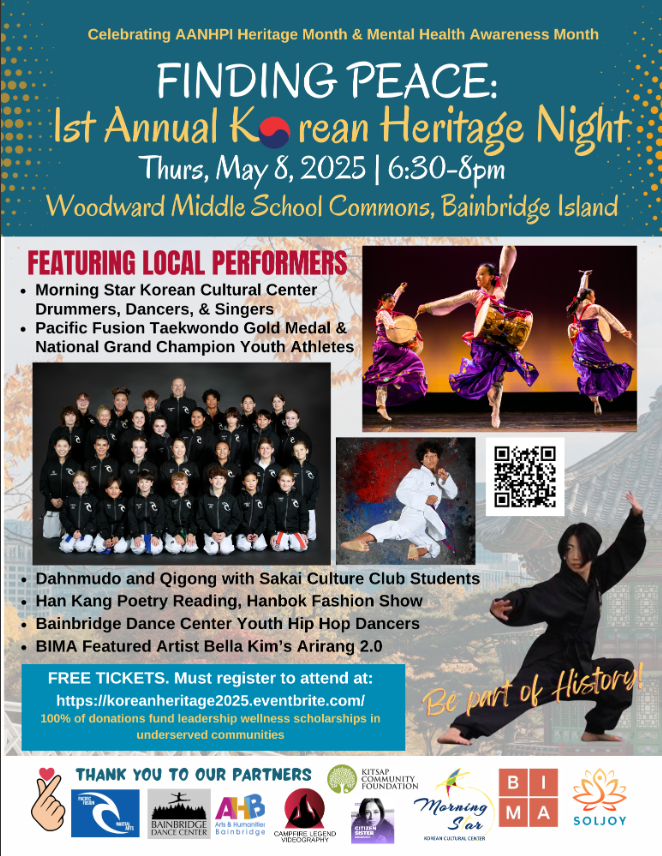 In celebration of AANHPI Heritage Month and Mental Health Awareness Month, this free cultural event highlights Korean music, dance, martial arts, poetry, and art. It features live performances by Morning Star Korean Cultural Center, Pacific Fusion Taekwondo youth athletes, Bainbridge Dance Center hip hop dancers, and more. A hanbok fashion show and art presentation by Bella Kim (BIMA) will also be part of the program.